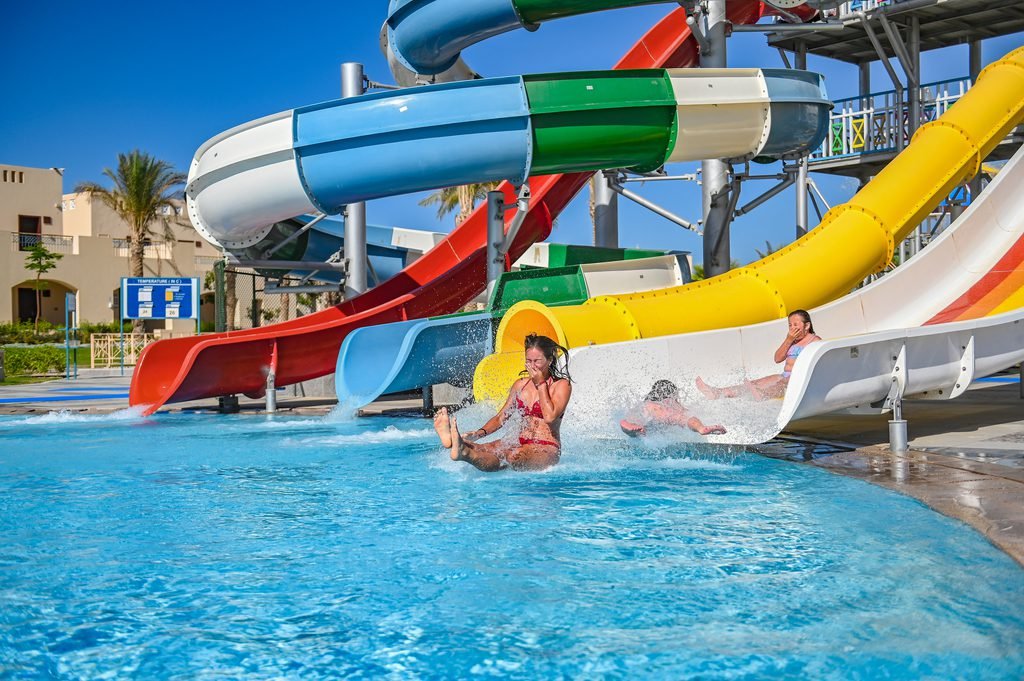 منتجع شامل كليًا يضم بحيرة سباحة خاصة، حديقة مائية تحتوي على 22 منزلقًا مائيًا، وشعاب مرجانية